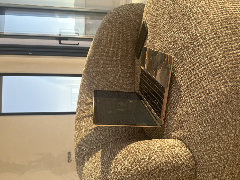 The image displays an interior room located in Krumovo, Bulgaria. A gold-toned Apple MacBook laptop, featuring a black and gold marble-patterned skin on its trackpad area, rests open on a large, curved armchair or sofa upholstered in a coarse, textured brown and beige fabric. The laptop screen displays content but also shows visible smudges and dust. To the immediate right of the laptop, a dark, rectangular electronic device, consistent with a smartphone or remote control, is positioned on the same furniture. Strong natural light enters the room from two prominent, black-framed windows or glass doors along the far wall, casting distinct shadows on the upholstered furniture. The walls on the left side of the room exhibit an unfinished appearance, with visible plasterwork and exposed electrical outlets near the floor. The windows provide an unobstructed view of a clear, bright blue sky and a distant, hazy landscape. No individuals are present in the scene, and no direct actions or interactions are depicted beyond the placement of objects.