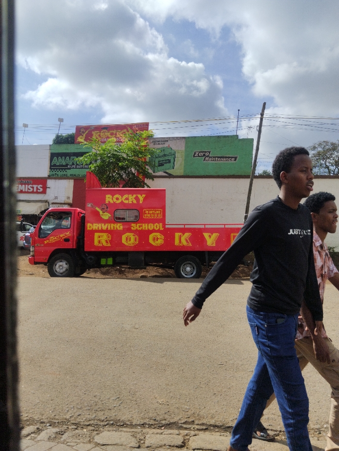 - "The image presents a street scene within Thika Township ward, Kenya, viewed from behind a dark vertical obstruction on the left foreground, under a sky with scattered white clouds" by FM-ceYJN2, licensed under CC BY 4.0