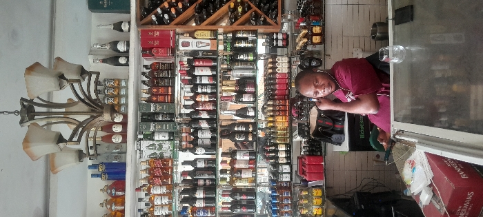 The image presents an interior view of a retail establishment, specifically a liquor store or bar, located in Abuja, Nigeria