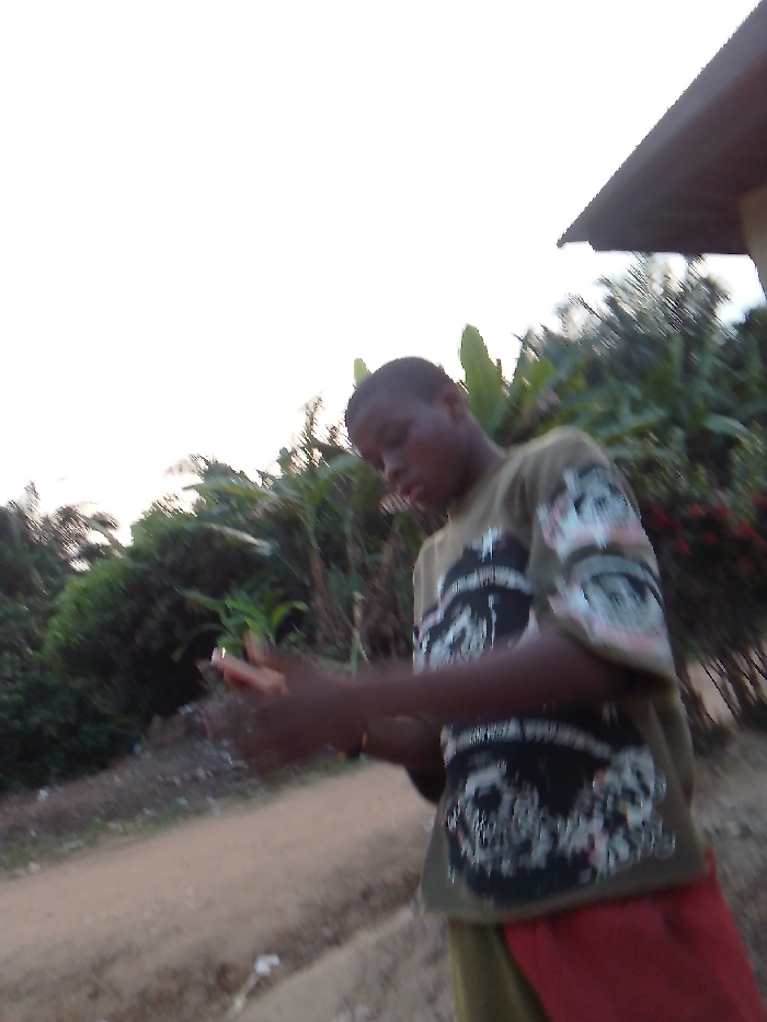 One young dark-skinned male is depicted outdoors in Unknown, Unknown. He is standing, facing slightly to the right, looking down intently at a light-colored, rectangular object held in both hands, resembling a mobile phone or a bar of soap with a visible light source at its upper edge. He wears a light olive-green t-shirt with black and white graphics on the front and sleeves, and red lower garments, possibly shorts or pants. A yellowish band is visible on his right wrist. The background consists of dense green foliage, including broad-leaved plants and trees, suggesting a tropical or subtropical environment. A dark brown roof structure is visible in the upper right corner, indicating a nearby building. The ground is unpaved, appearing as light brown dirt. The sky is bright white, suggesting daylight conditions. There are no other individuals or apparent interactions.