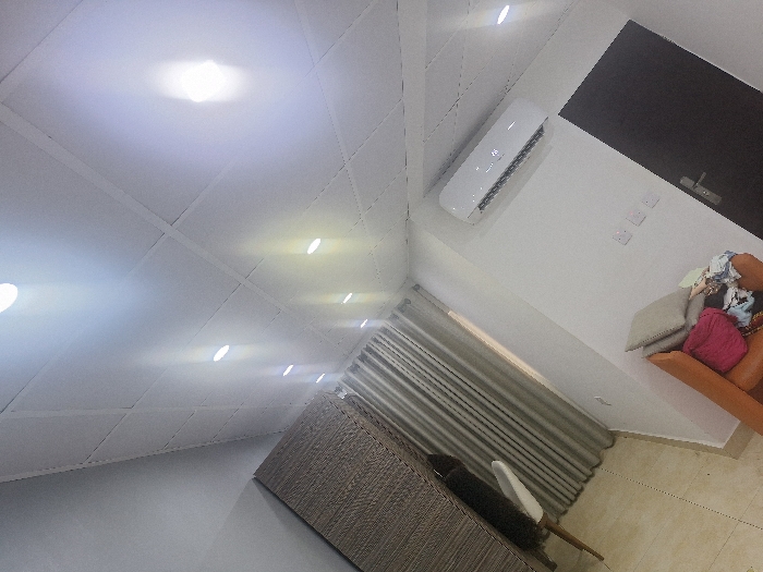 The image depicts an interior room in Close, Nigeria, viewed from an elevated, tilted perspective. The room features a white, square-tiled ceiling equipped with multiple recessed, illuminated spotlights. Walls are uniformly white. In the upper left, a dark brown wooden cabinet with horizontal grain is positioned against a wall, partially obscuring a light-colored chair. Behind these objects, a window is covered by vertical grey blinds. On the opposite wall to the right, a white split-unit air conditioner displaying "26" is mounted high. Below it, three white electrical outlets are horizontally aligned. A dark-colored door with a silver handle is visible on the far right. In the lower right, an orange or tan upholstered sofa or armchair contains a light grey cushion, a pink fabric item, and a patterned fabric item. The floor in the lower left consists of light-colored tiles. No individuals are present in the scene.
