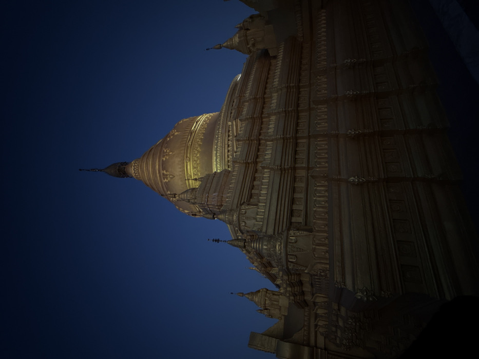 A golden pagoda towers against a deep blue sky. The pagoda's spire reaches upward, its surfaces shimmering with light and intricate details. A multi-tiered structure rises below, adorned with elaborate carvings and architectural elements. The color palette is dominated by shades of gold and blue, creating a visually striking contrast and emphasizing the pagoda's grandeur. The photograph is rotated on the side.
