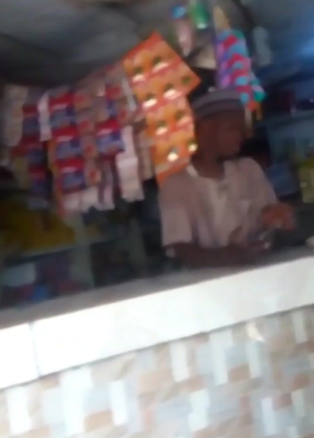 young man in a small store. He is standing behind a counter, looking at a cell phone in his hands. He's wearing a light brown shirt and a small, dark cap. Behind him and above his head are several items hung up for sale, including packets of biscuits and other small goods. The store appears to be small and enclosed. The front of the counter is tiled.