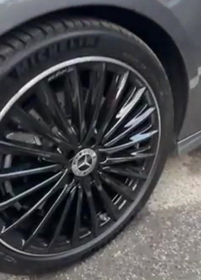 close-up of the front passenger-side wheel of a gray Mercedes car. The wheel has a black rim with a silver accent line and a Mercedes logo in the center. The tire is black. The camera then zooms out to show the front side of the car. The car is parked on a paved surface. Another car is parked behind the Mercedes. There are buildings and trees in the background.