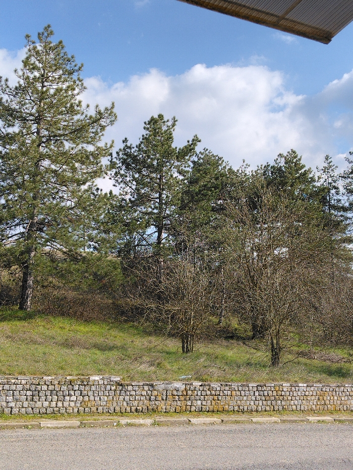 The image depicts an outdoor scene in Liaskovo, Bulgaria, under a blue sky with scattered white clouds. The upper right portion of a light-colored, corrugated metal overhang is visible at the very top. The background is dominated by a dense cluster of tall evergreen trees with dark green foliage, primarily pines. In front of and below these evergreens, a section of leafless deciduous trees and shrubs with bare branches is present, indicative of late winter or early spring. A grassy slope with varying shades of green and brown occupies the midground. Separating the slope from the foreground is a low, horizontal retaining wall constructed from irregular, light-colored stone blocks, approximately one meter in height. The immediate foreground consists of a grey asphalt or paved surface, possibly a road or parking area, with lighter-colored curb-like stones running along its edge parallel to the stone wall. No individuals, animals, or specific actions are discernible.