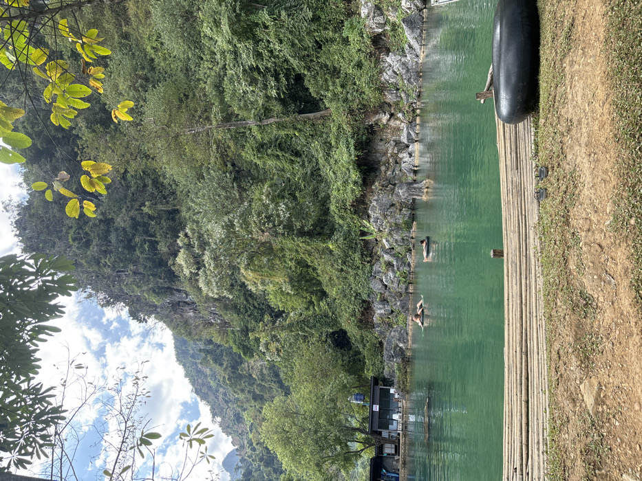 A vibrant landscape with a serene lake, surrounded by lush green mountains and foliage. A bamboo raft extends from the grassy shoreline into the emerald water, holding a black inner tube. Several people are swimming in the lake near the rocky edge. A building sits near the water's edge, nestled among the trees. The scene captures a peaceful, natural environment.