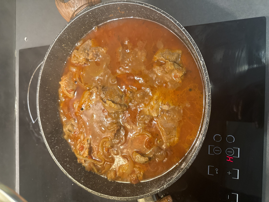 A dark-colored cooking pot, with a light-gray speckled interior and a partially visible wooden-look handle on the right, contains a simmering stew. The stew consists of numerous large, irregular pieces of reddish-brown meat, strands of cooked yellow-orange onions, and a thick, bubbling, reddish-orange sauce. Small dark specks, consistent with ground spices, are present within the sauce. The pot rests on a black induction or ceramic stovetop. The stovetop's digital touch controls are visible in the lower left, displaying a red "H" indicator, signifying residual heat or an active burner. The surface around the pot is a dark, matte countertop. No individuals are present. This scene depicts food preparation within a kitchen environment in Ljubljana, Slovenia.