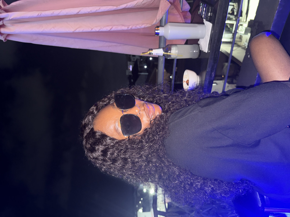 A woman with curly dark hair and sunglasses gazes at the camera. She wears a black top. Behind her, a pink canopy partially covers the scene. Two bottles, one white, are attached to a metal structure. A small cup is also visible. The background is dark, suggesting it's nighttime. Blue lighting illuminates the bottom of the image.