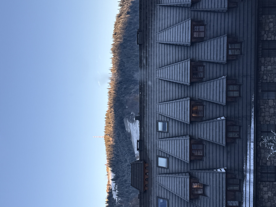 view of a building with a unique roof design featuring rows of triangular dormers with small windows. Adjacent to the building is a dense forest with patches of snow. A tall communication tower rises from the forest in the distance. The sky is clear and blue, suggesting a wintery, cold day. The composition suggests a remote location, possibly a ski resort.