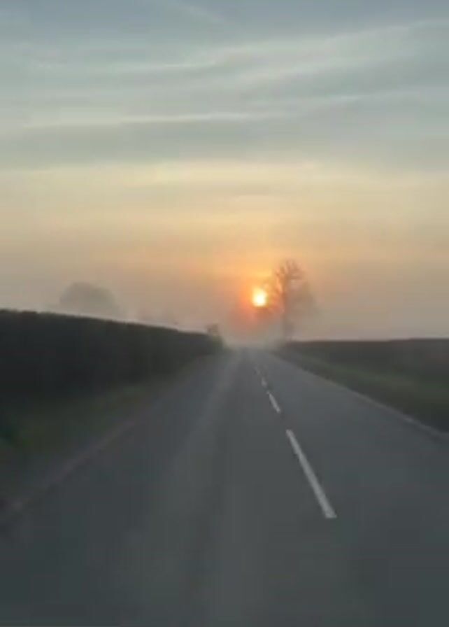 view from inside a moving car driving along a country road at sunrise. The sun, a bright orange orb, is partially obscured by a thick fog. A bare tree stands silhouetted against the sun. The road is lined with green hedges on both sides. There are road signs indicating a speed limit of 40 mph. The sky is a pale blue with wispy clouds.