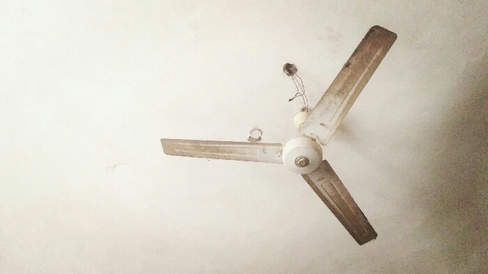 - "This image presents an upward-angled view of a three-bladed ceiling fan mounted against a uniform, light-colored ceiling in Rijiyar Zaki, Nigeria" by FM-hd7W33, licensed under CC BY 4.0