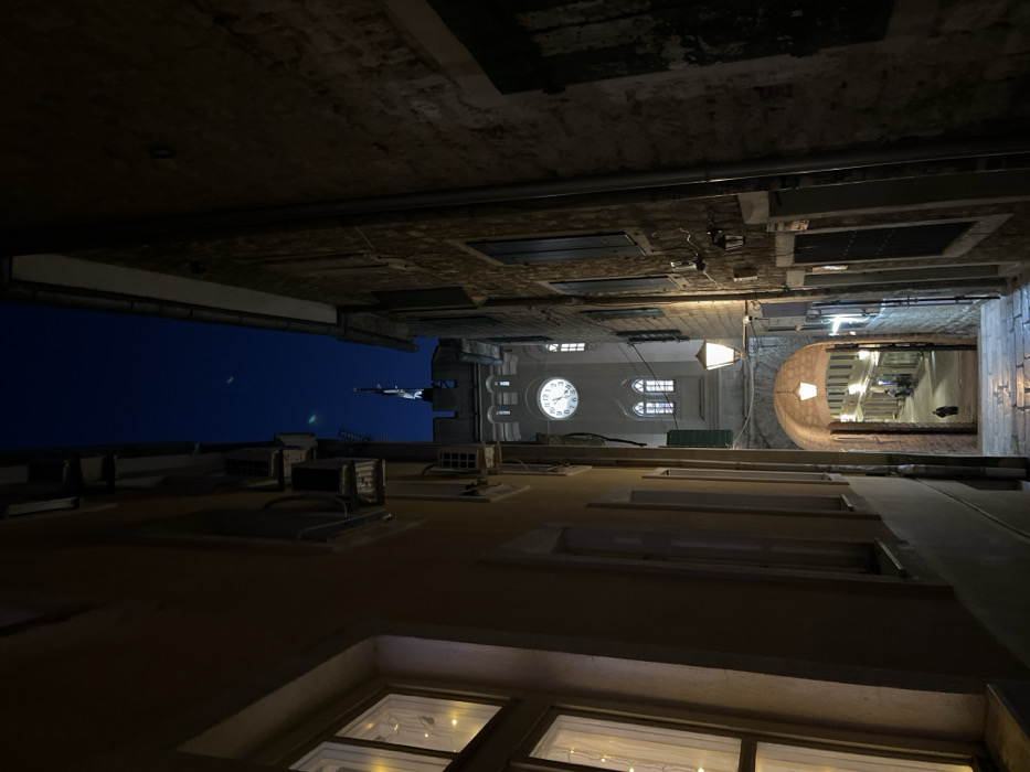 Looking straight up a narrow alleyway between tall buildings at night, a clock tower looms in the distance, displaying the time. A window is seen to the left, with lights strung inside. Dark sky peeks through above. Above the window are air conditioning units. The perspective is skewed, creating an unusual sense of depth. A hanging light fixture is visible along the building's wall above.