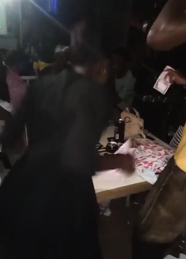 person with dark skin and wearing a black dress dancing energetically. Other people are milling around, including one person in a yellow shirt and someone wearing white. A table nearby holds cans of alcohol and some food wrappers. The environment is dark with artificial lighting.
