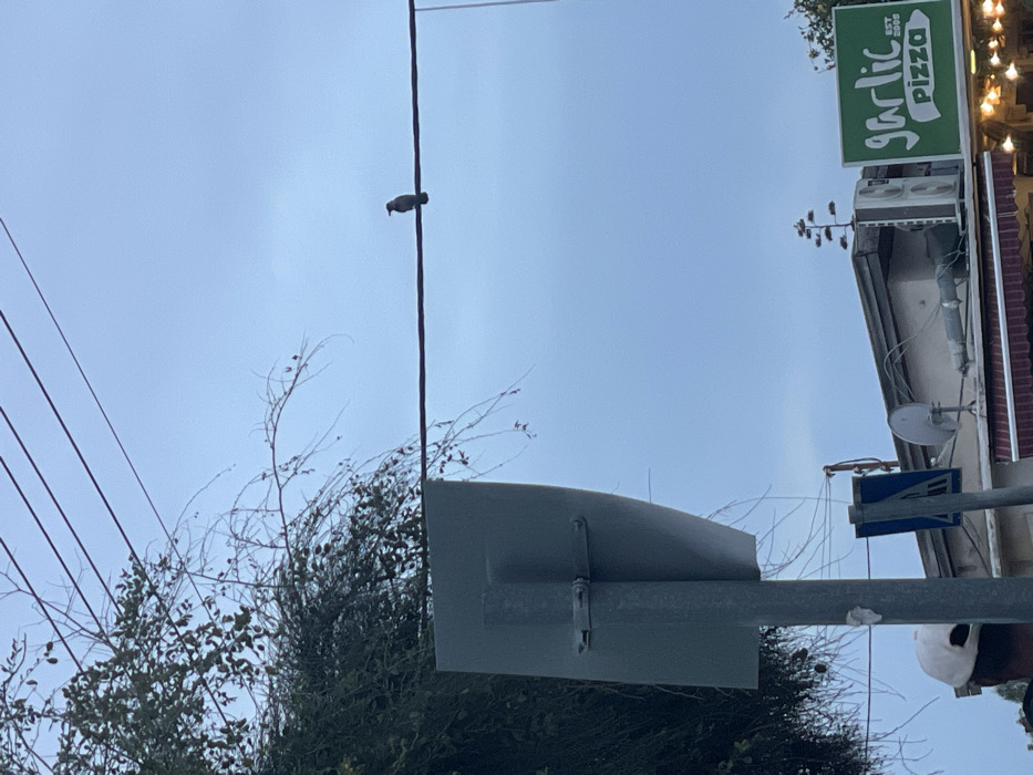 A bird sits on a wire against a cloudy sky. Below, a gray street sign is attached to a metal pole. A "Garlic Pizza" sign is visible on the right, near a building with an air conditioning unit. Bare branches and green foliage are near the base of the street sign. Power lines extend to the left of the central wire with the bird.