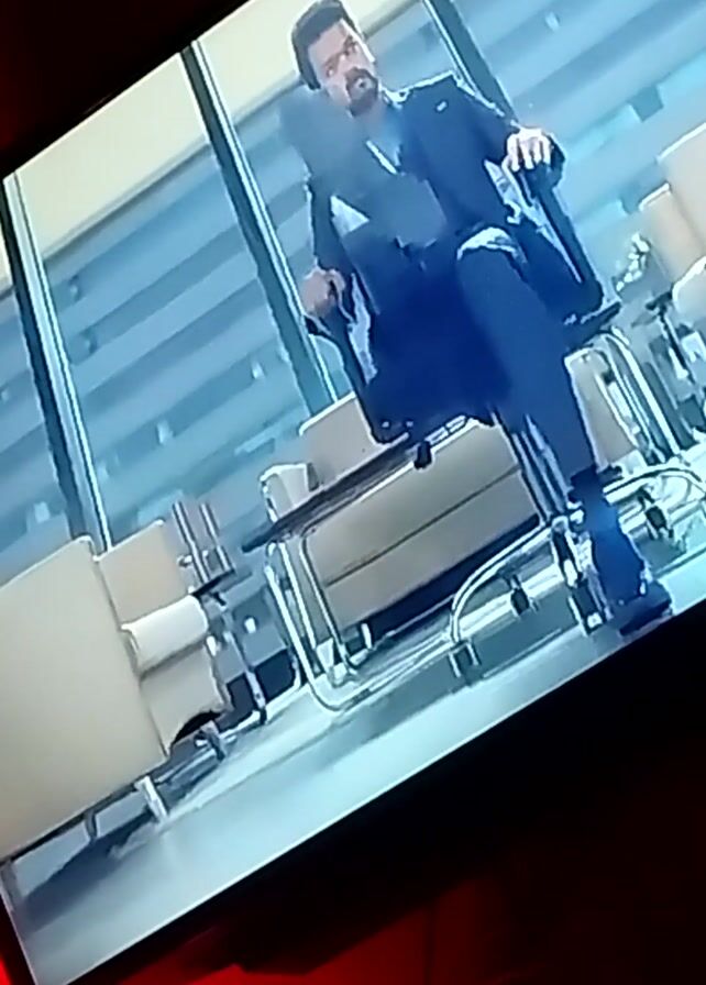 man in a suit and tie walking through an office with glass walls. The man appears to be in his 30s with short dark hair and a beard. He is pulling a wheeled suitcase behind him. The office appears to be modern with light-colored furniture and flooring. The camera angle changes, then shows two people, a man and a woman, looking up. The man has a beard and is wearing a blue suit jacket. The woman has gray hair and is wearing glasses. The background is blurry and indistinct. The video is filmed at an odd angle.