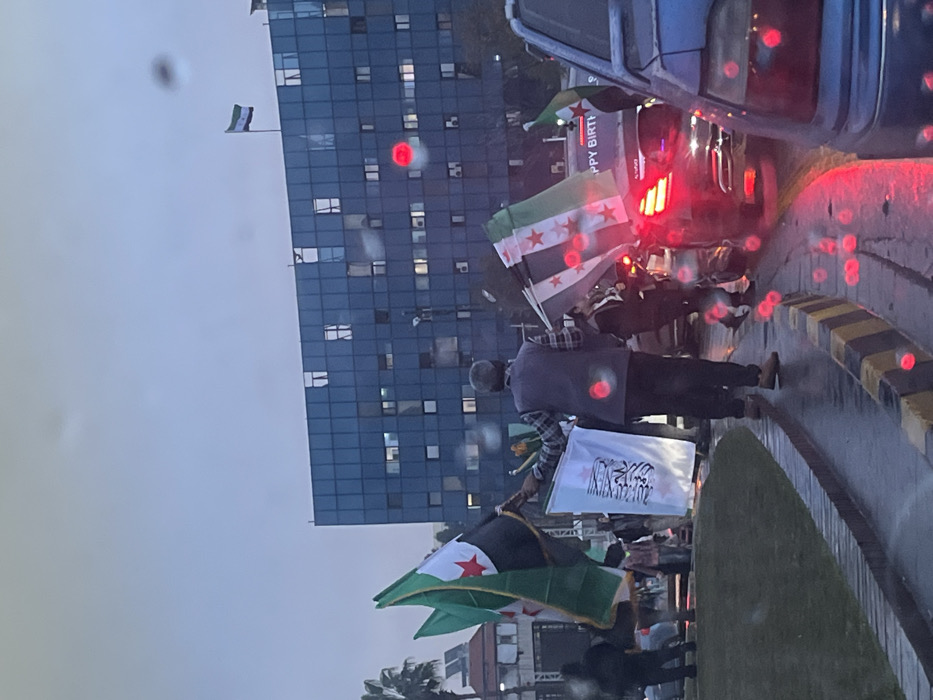 This image depicts a street scene in Al-Muhajerin Municipality, Syria, under an overcast sky, with evidence of recent or ongoing precipitation, as indicated by visible rain droplets and illuminated road surfaces. In the background, a large, multi-story building with a blue glass facade features numerous rectangular windows, some of which are illuminated or partially open. A flag with horizontal green, white, and dark-colored stripes, featuring a dark central emblem, flies from a flagpole on the building's rooftop. To the left, several palm trees are visible. The midground shows a paved road occupied by vehicles. A dark-colored sedan, oriented away from the viewer, displays illuminated red tail lights and "HAPPY BIRTH" in white text on its rear window. Other vehicles are partially visible, suggesting traffic flow. In the foreground, a man, viewed from behind, wears a dark vest over a plaid shirt and dark trousers. He stands on a concrete curb, which has yellow and black painted stripes and borders a grassy median strip. He holds multiple flags, including several flags with horizontal green, white, and black stripes and three red stars in the white stripe (consistent with the Syrian opposition flag). He also holds a white flag with black Arabic calligraphy, commonly known as the Shahada flag. Several other individuals are present on the street and median, some also holding flags, engaging in a public gathering or procession. Red circular lens flares are prominent across the image, likely from reflections of vehicle tail lights.