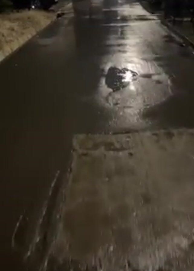 wet asphalt road on what appears to be a residential street at night. The road surface reflects light from streetlights, creating a glossy effect with puddles. Several cars are parked along the sides of the road, and some are further up the street. The camera moves slowly forward along the street. A patch of road appears to be a slightly different color and texture, possibly a repair. There are no people visible in the frame.