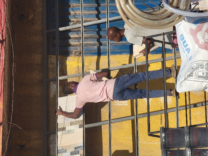 Two men are working on a building. One man in a pink shirt and blue pants is placing tiles onto a frame. The other man, wearing a gray shirt, appears to be assisting. Various items are visible: a blue and yellow wall in the background, a coil of tubing, a large bag with lettering, and stacked black buckets. The men are positioned within a metal framework.