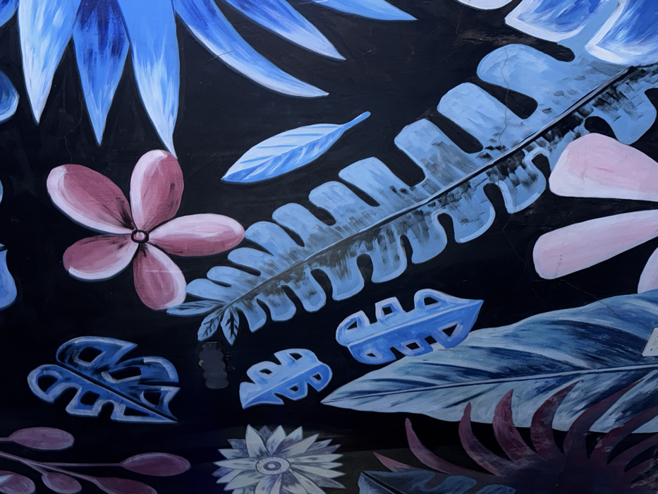 The image displays a close-up view of a painted surface, identified as being in Adankolo, Nigeria. The scene is a stylized botanical mural featuring various tropical leaves and flowers against a black background. Predominant colors include multiple shades of blue for the foliage, ranging from light sky blue to darker cobalt and navy. Several distinct leaf types are visible, including large, serrated fern-like fronds and smaller, perforated leaves resembling Monstera. Additionally, multiple five-petaled flowers, rendered in soft pink and deeper rose hues, are interspersed throughout the composition. Darker, reddish-purple foliage elements are also present, particularly on the left side of the frame. The painting exhibits a flat, illustrative style. No people, active scenes, or direct interactions are depicted. The painted surface shows minor textural inconsistencies and what appear to be subtle cracks, indicating a physical wall or panel.