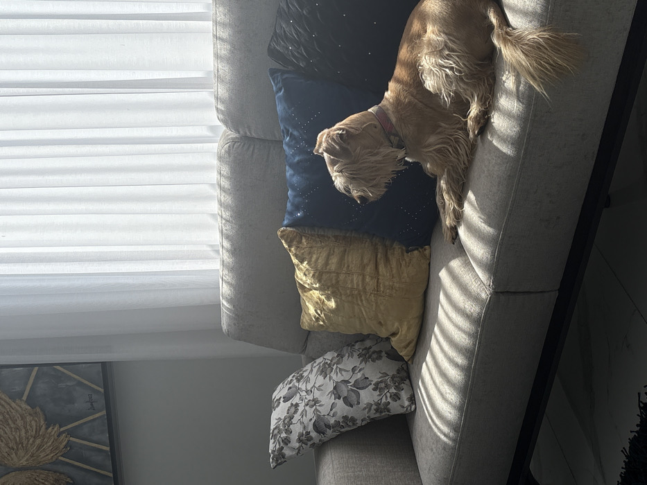 The scene depicts the interior of a residence in San Bernardino Tlaxcalancingo, Mexico. A tan-colored dog with shaggy fur, wearing a pink-patterned collar, is lying on a light gray fabric sofa. The dog is positioned facing right, away from the viewer, with its body illuminated by direct sunlight. The sofa is upholstered in a light gray fabric and holds four decorative pillows: a white pillow with a gray floral pattern on the far left, a gold-colored velvet pillow, a dark blue pillow with small light speckles, and a black quilted pillow on the far right. Sunlight streams in from a window on the right, covered by sheer white vertical curtains, casting distinct horizontal shadow stripes across the sofa cushions. On the upper left wall, a framed artwork featuring golden wing-like structures against a dark background is visible. The floor at the bottom of the frame appears to be light-colored tile, with a portion of a dark, shaggy rug in the lower left corner. No people are visible. The dog is inactive, in a resting position.