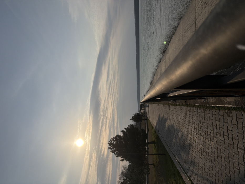 The image depicts a tranquil riverside promenade in Lom, Bulgaria, during a time of day characterized by low sunlight and long shadows, likely late afternoon or early morning. The scene is observed from a slightly elevated position looking down the length of the promenade and across a wide body of water, presumed to be the Danube River. In the foreground and extending into the midground, a dark-colored metal railing runs horizontally along the right side, separating a paved walkway from the water. The top bar of this railing is prominent and shows a slight metallic sheen. To the left of the railing, a grey interlocking paver walkway stretches into the distance. Adjacent to the walkway's left edge is a strip of grass. Along this grassy strip, several trees are visible. A large, dark evergreen tree stands prominently in the midground, casting a long shadow diagonally across the pathway to the right. Further down the promenade, additional deciduous trees, currently bare, and at least two streetlights are discernible, also casting shadows. A bench is faintly visible further in the distance along the promenade. The water body occupies the right half of the image, appearing calm with minimal surface disturbance, reflecting the ambient light. The far bank across the water is visible as a dark, tree-lined horizon, suggesting a distant landmass. Small, dry vegetation is present on the embankment between the railing and the water. An indistinct, small object, possibly a boat, is visible on the water near the far bank. The sky is a pale blue, transitioning to a darker grey-blue towards the right. Stratiform or cirrus clouds are horizontally layered across the upper half of the frame. The sun, a bright, distinct disk, is positioned in the upper left quadrant, partially obscured by thin clouds, and creates a noticeable lens flare effect. No people or animals are present in the scene.