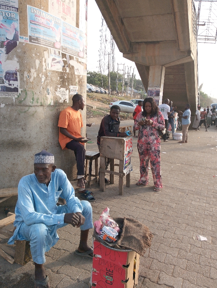 The image depicts a bustling street scene in Kagini, Nigeria, beneath a concrete overpass. In the foreground, a man with dark skin, wearing a light blue traditional tunic, trousers, and a patterned skullcap, sits on a small wooden stool, looking towards the left. In front of him is a red cardboard box functioning as a stand, topped with a brown woven sack containing plastic-wrapped items. To the right, standing prominently, is a woman with dark skin wearing a vibrant red, pink, and white floral patterned jumpsuit. She holds a smartphone with both hands, looking down at the screen. Adjacent to her, a man with dark skin, wearing a dark jacket and trousers, sits on a wooden stool behind a small wooden stand that displays a "POS" sign. He appears to be attending to items on the stand. Further left, another man with dark skin, wearing an orange t-shirt and dark trousers, sits leaning against a weathered concrete pillar of the overpass, looking left and holding a small dark object. The concrete pillar is heavily covered with various posters and advertisements, including "INDIA DOCTOR." The overpass structure extends overhead, casting a shadow. The ground is paved with interlocking concrete blocks. In the background, an upward-sloping road is visible with several parked cars. A tall metal lattice tower, power lines, and utility poles are also visible against a bright sky. Numerous other individuals are present in the midground and background, standing or walking along the paved area beneath the overpass.