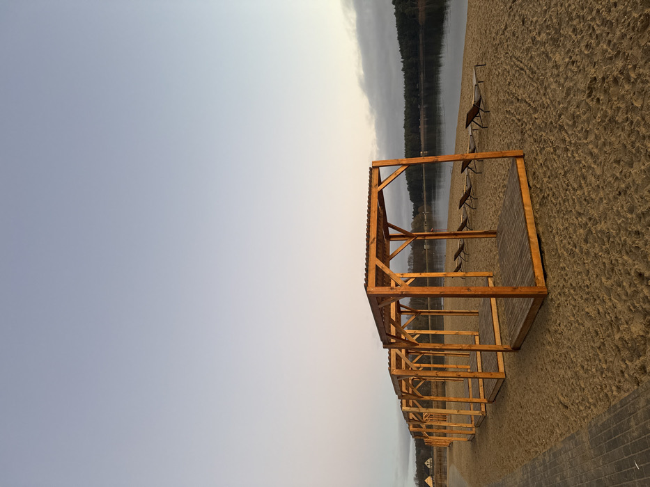 A sideways view of a sandy beach with wooden canopies and metal chairs facing a lake. The beach is lined with rows of open, square structures, likely cabanas or lounging areas. The lake is bordered by trees under a gray sky. The scene gives a sense of tranquility with a simple, natural landscape. A dark walkway is visible at the bottom of the photo.
