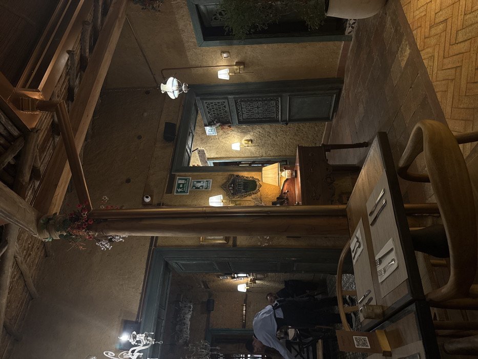 This image depicts the interior of a restaurant or establishment located in El Retiro, Colombia, at nighttime or under dim lighting conditions. The environment features rustic architecture with textured, light brown walls and an exposed wooden beam ceiling composed of dark timbers and planks. The flooring is brick, laid in a herringbone pattern in the foreground and a linear pattern further back. In the immediate foreground, two wooden dining tables are set with light-colored placemats, forks, and knives. A wooden chair with a curved back is visible closest to the viewer. On the left edge of the nearest table, a small wooden sign displays a QR code. To the left of the central view, a male individual, appearing to be a waiter, is seen bending over a table, wearing a light blue shirt with rolled sleeves and a dark apron or trousers. Partially visible behind him is another male individual seated at a table. A multi-armed chandelier with glowing bulbs hangs from the ceiling in this section. Centrally, a robust wooden column, adorned with garlands of artificial red, pink, and white flowers, extends from floor to ceiling, serving as a partition. Behind this column, against the textured wall, stands a dark wooden console table with intricate carvings. Upon this table rests a table lamp with a patterned shade, emitting warm light. Above the console table, an ornate, gold-framed mirror reflects a portion of the room, flanked by two wall sconces. Further right, a prominent dark teal-colored wooden door, featuring elaborate carved patterns, is slightly ajar within a matching doorframe. Above this doorway, two green emergency exit signs with white pictograms are affixed to the wall. A small black security camera is mounted above the signs. To the right of this doorway, a vintage-style white glass hanging lamp is suspended from the ceiling. On the far right, another dark teal door is visible, and a large white planter containing a green plant sits near the wall. The entire scene is illuminated by various warm artificial light sources, including the chandelier, wall sconces, table lamp, and hanging lamp.