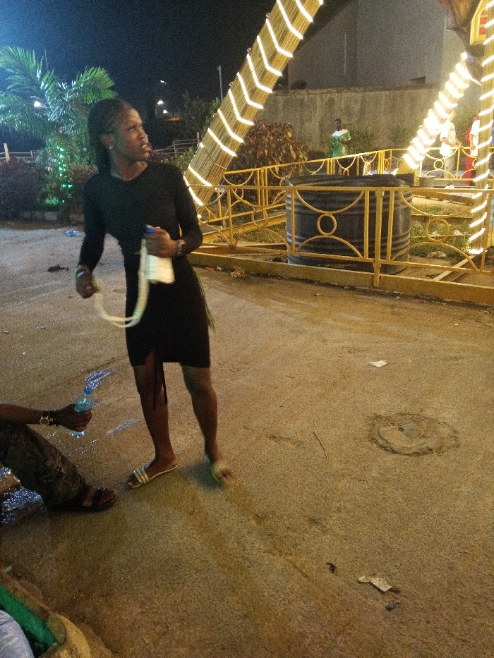 A person in a black dress stands in a dimly lit outdoor area. They hold a white object and face left. A man sits to the left, holding a water bottle. Illuminated arches decorate the background, along with foliage and a dark container with circular designs. The ground is paved and appears slightly wet, with scattered debris. Other people can be seen distantly in the background.