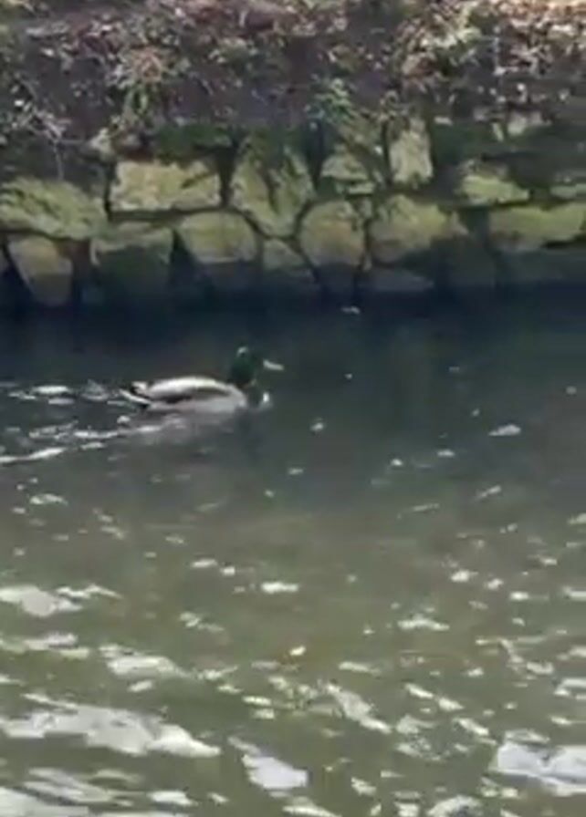 mallard duck swimming in a narrow waterway with a rock wall on one side