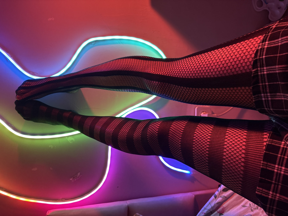 A pair of human legs, from above the knee to the feet, are depicted elevated vertically against a wall. The left leg is encased in black fishnet hosiery featuring opaque horizontal stripes, while the right leg is in black fishnet hosiery with opaque vertical stripes. A dark plaid skirt is visible on both legs, positioned at the lower end of the visible sections. The background wall is illuminated by a wavy, flexible LED strip light displaying a color gradient from purple, blue, green, to red. This light casts strong magenta and red ambient light across the wall and the legs. A white electrical outlet with two circular sockets is present on the wall in the lower right. A light-colored upholstered surface is partially visible on the far left. The scene occurs indoors, in a private setting, in Yerevan, Armenia.