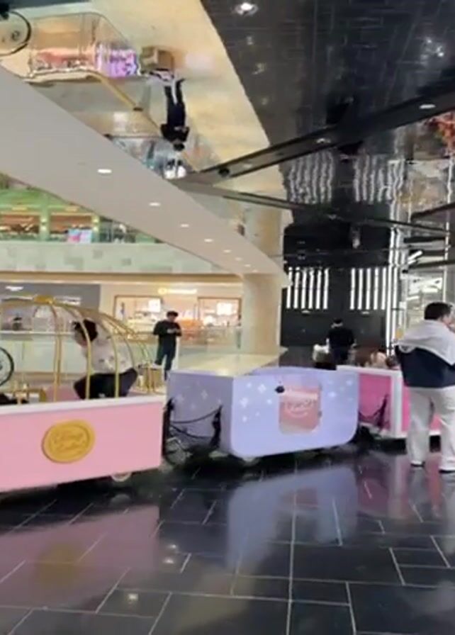 interior of a shopping mall with a distinctive black and white floor and reflective ceiling