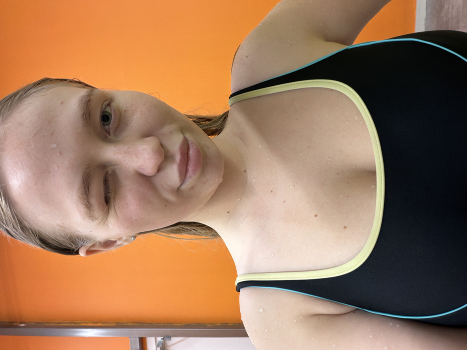 The image displays a wet female individual, visible from the chest up, against a vibrant orange background. Her light-colored hair is wet, and her skin, which is fair with some freckles, is covered in small water droplets. She is winking with her left eye and has a slight pout on her lips, looking directly at the viewer. She wears a dark-colored (likely black) one-piece swimsuit featuring a light yellow/lime green trim along the neckline and shoulder straps, and a light blue/teal vertical stripe detail on her left side. A silver stud earring is present in her left ear. To the left of the frame, a portion of a vertical metallic or light-colored structural element, consistent with a doorframe or partition in a changing room or shower facility, is visible. The specific location within the city of Saint Petersburg, Russia, cannot be determined from the visual information provided.