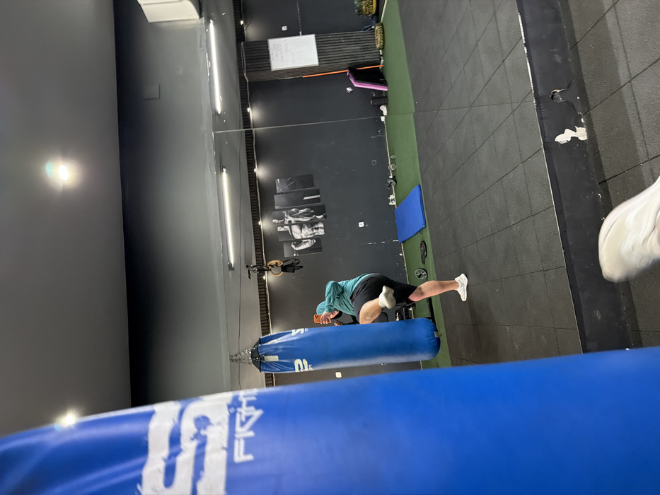 The image displays the interior of a fitness gym located in Vratsa, Bulgaria. The scene is captured through a reflection in a large wall-mounted mirror, which dominates the central and right portions of the frame. In the left foreground, a prominent blue punching bag, branded with white "S FIGHT" lettering, is partially visible. In the midground, seen within the mirror's reflection, a male individual is performing a physical exercise. He wears a teal or greenish hooded long-sleeve top, black athletic shorts, and white athletic shoes. He is positioned to the right of a blue punching bag, similar to the one in the foreground, and is captured mid-motion executing a knee strike against it. His right hand holds a smartphone, which is aimed towards the punching bag and himself, suggesting he is recording or photographing his workout. The gym's environment, visible in the reflection, features dark grey walls and a black rubber tiled floor. The ceiling is illuminated by several linear fluorescent lights and smaller spotlights. On the far wall, a multi-panel art piece depicting a muscular male torso is mounted. To its right, gymnastic rings hang from the ceiling. Further right, various fitness equipment is arranged on the floor, including a blue exercise mat, several circular weight plates, a purple foam roller, and a white whiteboard with handwritten text. The lower center of the image shows the reflection of a white athletic shoe, indicating the perspective of the photographer.