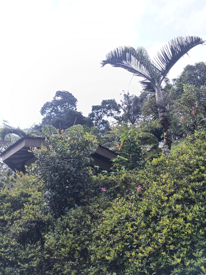 This image depicts a densely vegetated hillside in Soibada, East Timor, under a bright, overcast sky. The foreground and midground are dominated by numerous lush green bushes and trees with small leaves, some exhibiting lighter green new growth. Scattered among these bushes, two small pink flowers are visible. On the right side, a tall palm tree with large, dark green fronds and a textured, light brown trunk extends upwards. To the left, partially obscured by the dense foliage, the corner of a building or shelter with a dark, sloped roof and a lighter underside is visible. Taller, darker green tree canopies form the background beneath the bright sky. No people or animals are present.