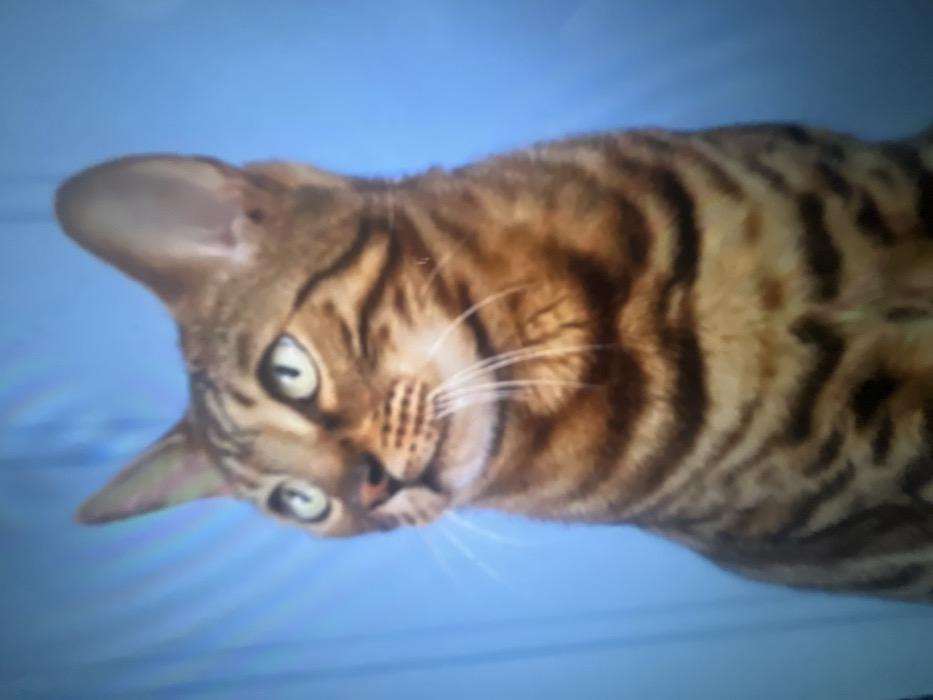 - "A Bengal cat lies on a blue surface, angled slightly toward the viewer" by FM-PKmM32, licensed under CC BY 4.0
