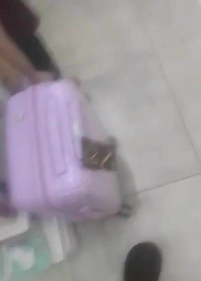 person shopping in a store. The video starts with a close-up shot of a lavender suitcase next to a shelf with items on it. The camera then moves to follow the person as they walk through the store, passing shelves with clothes and other items on display. A Christmas tree with lights on it is also visible. The person appears to be looking at items on the shelves. The camera is shaky and the lighting is somewhat dim.