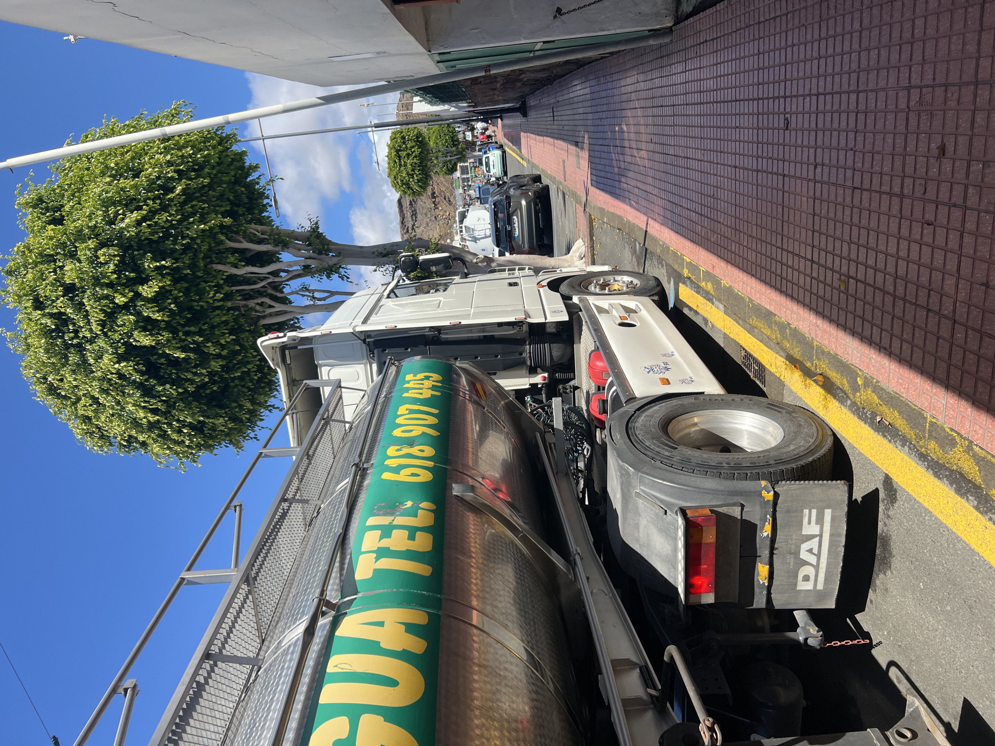 - "A DAF tanker truck, primarily white with a metallic cylindrical tank, is parked on the left side of a narrow street under a clear blue sky in Puerto Rico de Gran Canaria, Spain" by FM-33L543, licensed under CC BY 4.0