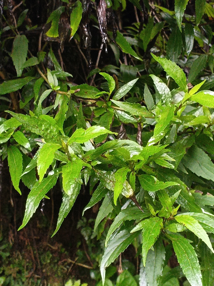 Lush green leaves dominate the image, exhibiting elongated shapes with pointed tips. The foliage appears dense, creating a visually rich texture. The leaves are vibrant with visible moisture, possibly from rain or dew. Darker stems and branches peek through the leaves, providing depth to the composition. The background is blurred, suggesting a natural outdoor setting. Overall, the image captures a vibrant display of plant life.