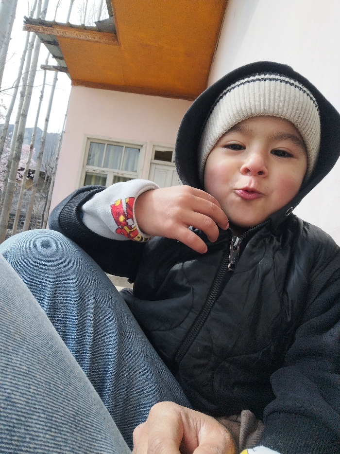 A young child is depicted in a close-up, low-angle perspective, seated on an adult's lap. The child, wearing a black hooded jacket, a white knitted beanie with black stripes, and a white long-sleeve shirt displaying a colorful cartoon graphic on the sleeve, looks directly at the camera with pursed lips. Their right hand is positioned near their chin. The foreground includes portions of an adult's leg clothed in blue denim jeans and a hand. In the background, a light pink building features a white-framed window and door. Above the building, a prominent orange wooden overhang with a decorative frieze is visible. To the left, several tall, slender, bare deciduous trees stand against a bright sky, with distant mountains appearing in the far background. The scene is located in the city of Limbur, Uzbekistan.