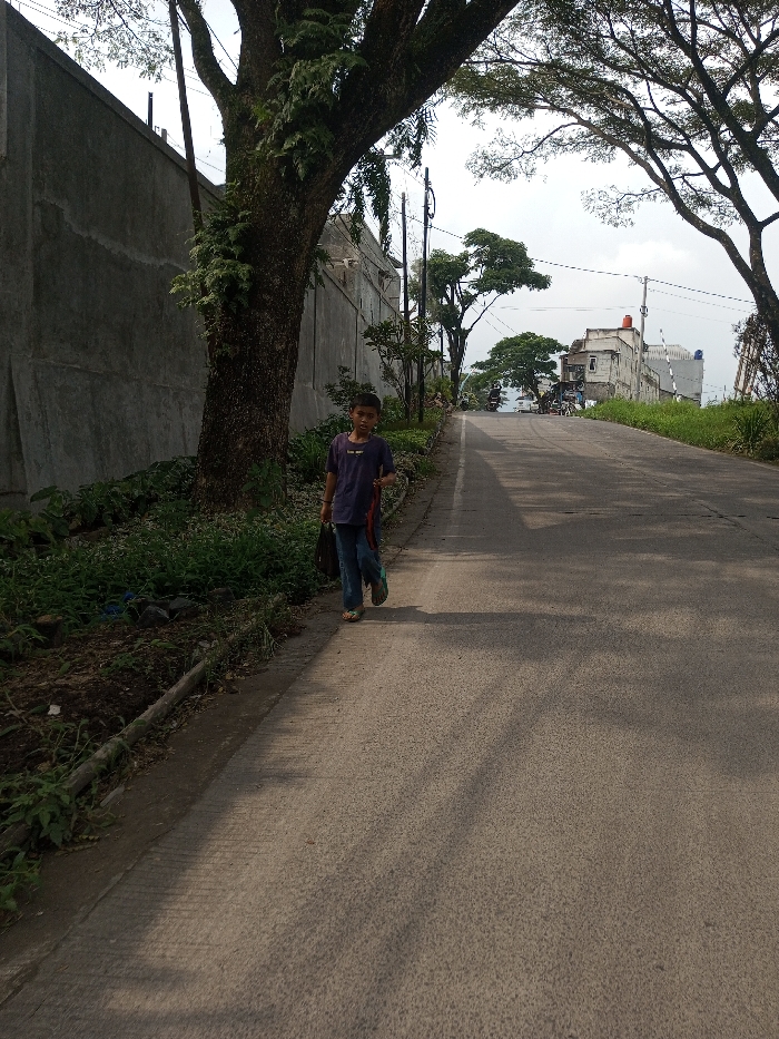 The scene depicts a paved road in Sandamal Eliya, Sri Lanka, ascending into the distance under an overcast sky. A young boy, appearing to be of school-going age, walks on the left side of the road's edge. He is dressed in a dark blue short-sleeved shirt and blue trousers, wearing light-colored flip-flops. In his left hand, he carries a black bag, and in his right hand, he holds a red-orange strap-like object. He is looking directly towards the viewer. To his immediate left stands a large tree with a thick trunk and green foliage, growing adjacent to a tall, grey concrete wall that extends along the left perimeter of the road. Below the wall, a strip of unkempt green vegetation is visible. Further up the road, more trees and utility poles line the path. In the background, on the right side of the road, several buildings are visible, including a multi-story structure with a red water tank on its roof. Shadows from overhead trees are cast across the asphalt road surface. In the far distance, faint outlines of vehicles and possibly other individuals can be observed on the ascending road.