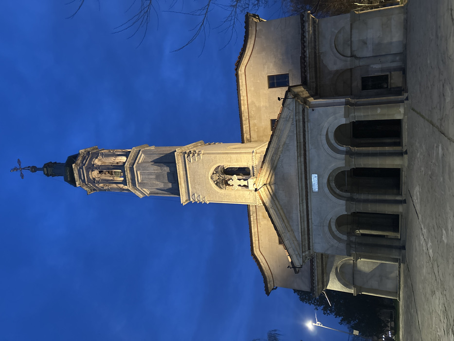 The image displays a large, illuminated architectural structure, identified as a church or similar institution, situated in the city of Unknown, Unknown. The scene is captured at dusk or night, under a deep blue, partially cloudy sky. The primary subject is a multi-tiered building constructed of light-colored stone or stucco. A tall, central bell tower dominates the composition, tapering upwards and culminating in a decorative cross. The upper section of the tower features an open belfry with arched openings, through which a bell is visible. Below the belfry, a sculptural niche contains an ornate cross. The main facade of the building features a portico with three arched entrances, each supported by columns. Above the portico, a plain rectangular inscription panel is visible. The side wings of the structure exhibit gently curving tiled roofs and small rectangular windows. The foreground consists of a paved plaza or courtyard, illuminated by the building's lights and an external source. To the far left, a modern street light pole with a bright, white light is present. On the right side of the frame, bare tree branches are silhouetted against the dark sky. No individuals, overt actions, or interactions are depicted.