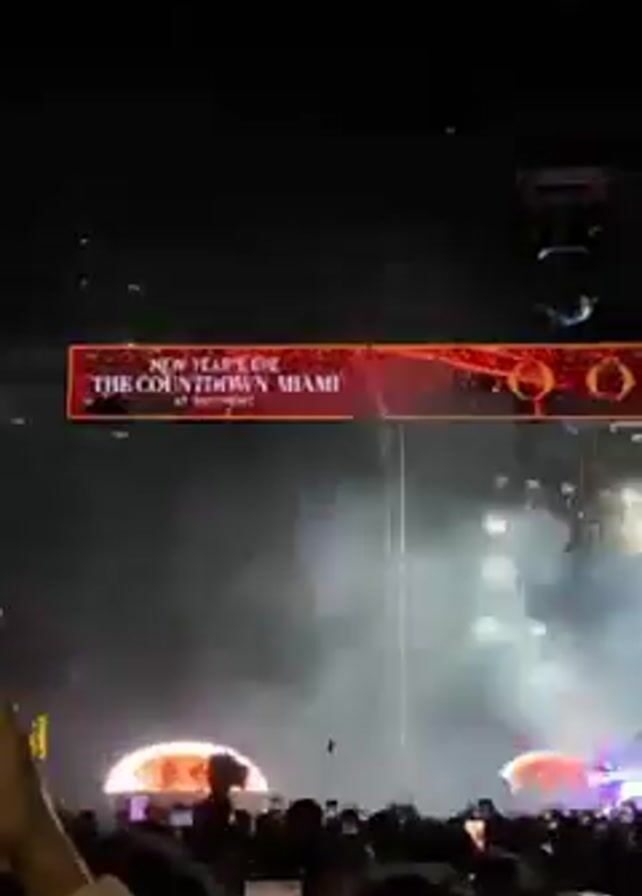 A crowd of people stands watching a stage during an outdoor concert, apparently for New Year's Eve. Above the stage is a sign that reads, "NEW YEAR'S EVE, THE COUNTDOWN MIAMI." The stage is dark but lit by stage lights and features three large video screens playing colorful, abstract graphics and images of ice cream cones. Many people in the audience are holding up cell phones to record the show.