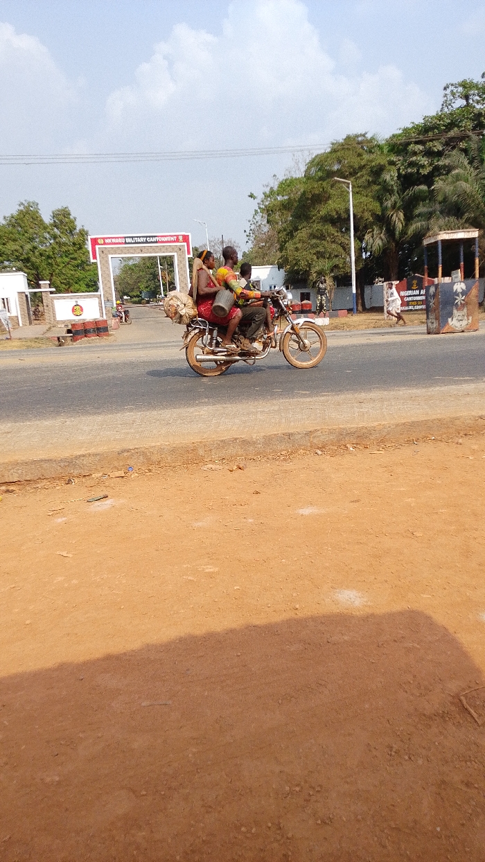 - "Three people ride a motorcycle on a road leading to the “NWAGU MILITARY CANTONMENT" by FM-gtXld2, licensed under CC BY 4.0