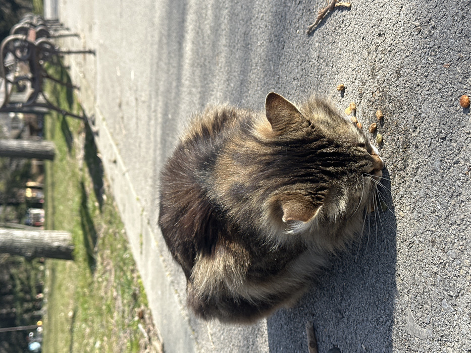 - "A medium-haired tabby cat, exhibiting brown and black striped fur, is crouched on a gray asphalt or concrete path, actively consuming pieces of dry kibble scattered directly in front of its muzzle" by FM-B3HLs1, licensed under CC BY 4.0