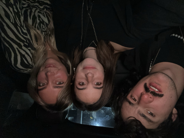 Three people pose closely together for a photo taken from a low angle. On the left, a woman with blonde hair wears a black and white zebra-striped top. In the middle, a woman with brown hair wears a black top. On the right, a man with curly hair wears a black top and a fake mustache. All three have similar skin tones and are looking directly at the camera. They are wearing jewelry, and the background is dark.