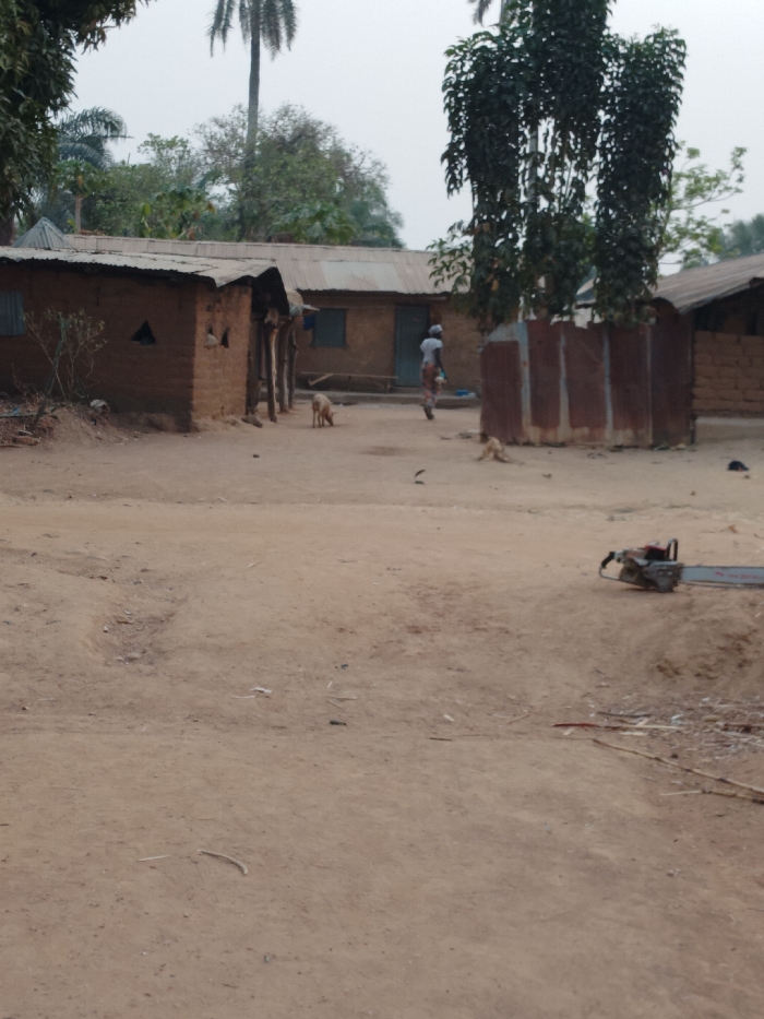 A rural landscape reveals simple, earthen structures with corrugated metal roofs under an overcast sky. A figure walks between the buildings, accompanied by dogs. A chainsaw rests on the sandy ground, contrasting with the rustic setting. The scene conveys a sense of everyday life in a village environment.