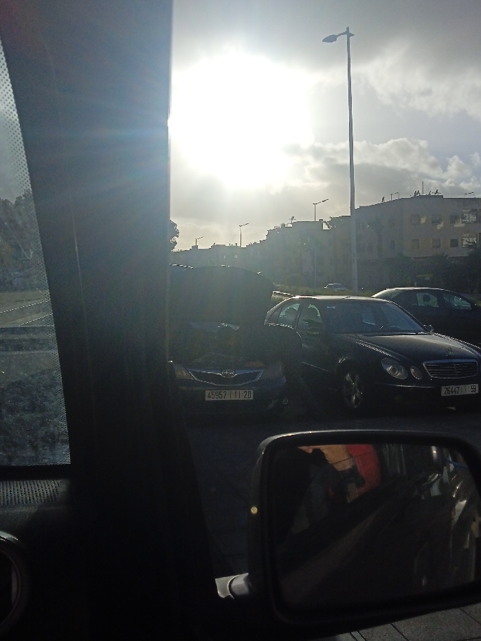 The image depicts a street scene in Salé, Morocco, observed from within a vehicle. The view is partially obstructed on the left by the vehicle's dark door pillar and window frame, which also exhibits significant sun glare and lens flare originating from the bright, cloudy sky. In the midground, multiple vehicles are visible. Directly ahead and slightly left, a dark blue or grey Subaru sedan with Moroccan license plate "45957 | 1 | 20" is positioned. Its hood appears to have a dark, possibly tarp-like material or debris covering a section. To the right of the Subaru, a dark Mercedes-Benz E-Class sedan (W211 generation) with Moroccan license plate "26447 | T | 59" is parked or stopped. A tall, light-colored street light pole stands prominently behind these vehicles. The background features a row of multi-story buildings, characterized by light-colored facades and visible rooftop satellite dishes, suggesting residential or mixed-use structures. The sky is largely overexposed due to direct sunlight, indicating daytime conditions. A vehicle's side-view mirror is visible in the lower right foreground, reflecting a blurry image of the vehicle's interior, including a partial, indistinct human figure and hints of red or orange color.