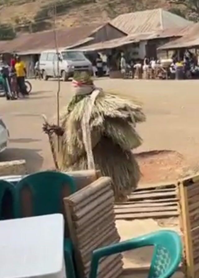 person dressed in a full-body costume made of dry grass or straw standing on a road in a village or small town