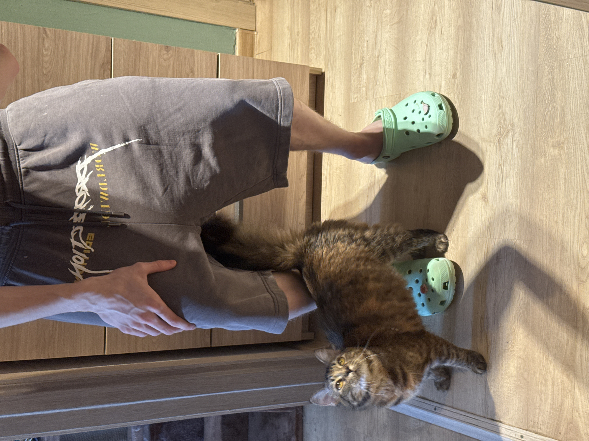 This image captures an indoor scene in Murino, Russia, depicting the lower half of a person and a domestic cat. The person stands facing forward, wearing grey sweat shorts adorned with reversed white and yellow text ("DROWLDH") and white streaks, possibly paint. Their bare legs are visible, and they wear light mint green Crocs clogs, the right one featuring a small red and white charm. The person's right hand rests on their right thigh. A tabby-patterned cat, with brown, black, and lighter fur and yellow eyes, stands on all fours between the person's legs, looking upwards towards the person's unseen face. Its bushy tail is erect. The flooring is light-colored wooden laminate or vinyl planks, with a metallic threshold strip visible on the left. In the background, light brown wooden furniture, possibly a dresser or cabinet, is visible. A wall section on the right is painted a muted green or teal color with a wooden baseboard. Light from an unseen source casts distinct shadows of the person and cat on the floor towards the lower right.